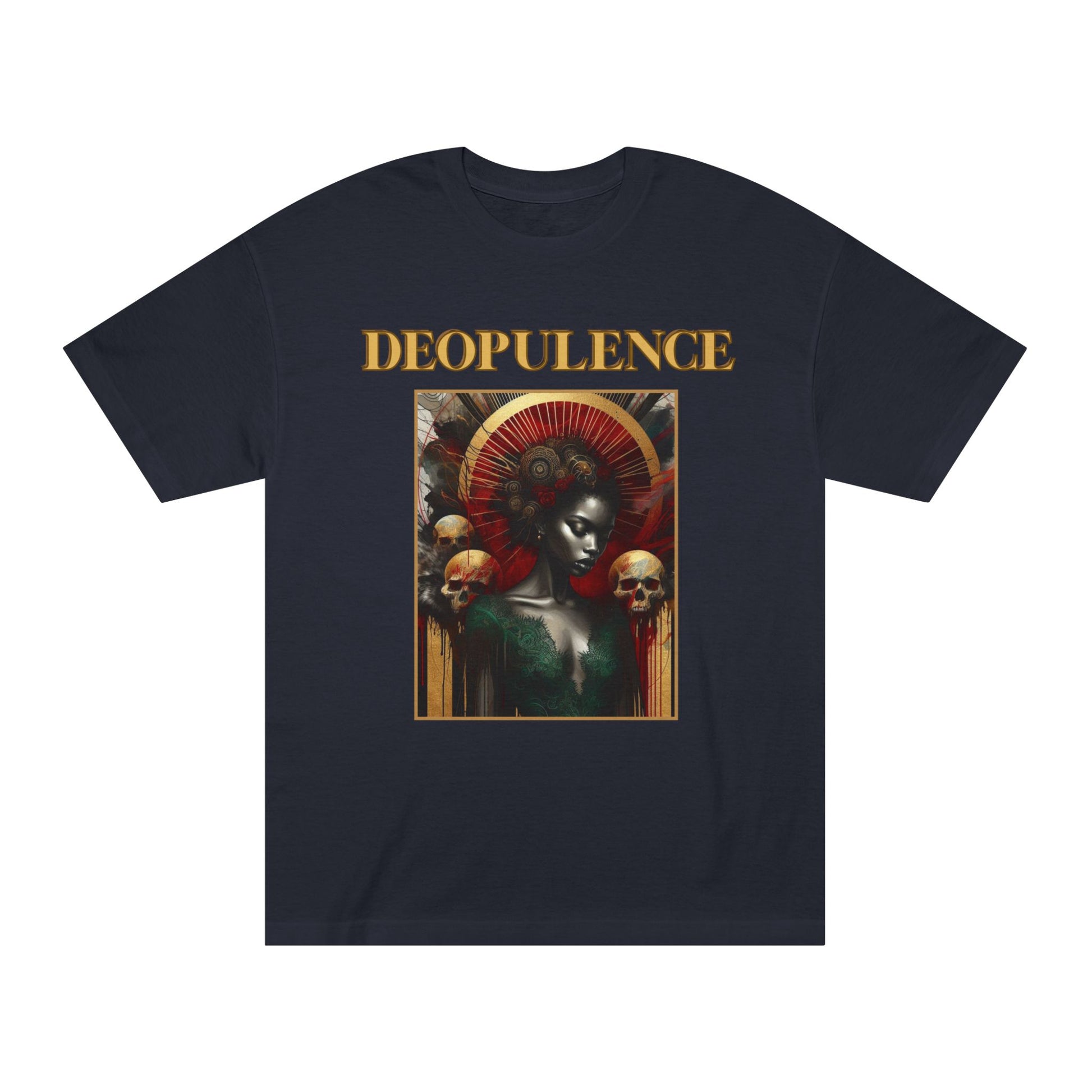 This classic tee channels a dark, elegant vibe — think gilded shadows and baroque whispers. The design, “Horrors Gold Opulence,” sits like an antique medal on deep fabric: ornate gold tones against rich black or deep jewel hues, giving the shirt a quiet, dramatic presence. Wear it when you want to lean into moody evenings, gallery crawls, late-night readings, or intimate gatherings where texture and atmosphere matter. It drapes in a familiar, comfortable way, so it becomes part of your routine wardrobe whether you're layering under a coat or standing alone as the statement piece. The result is understated theatricality: refined, a little unsettling, and memorably stylish.