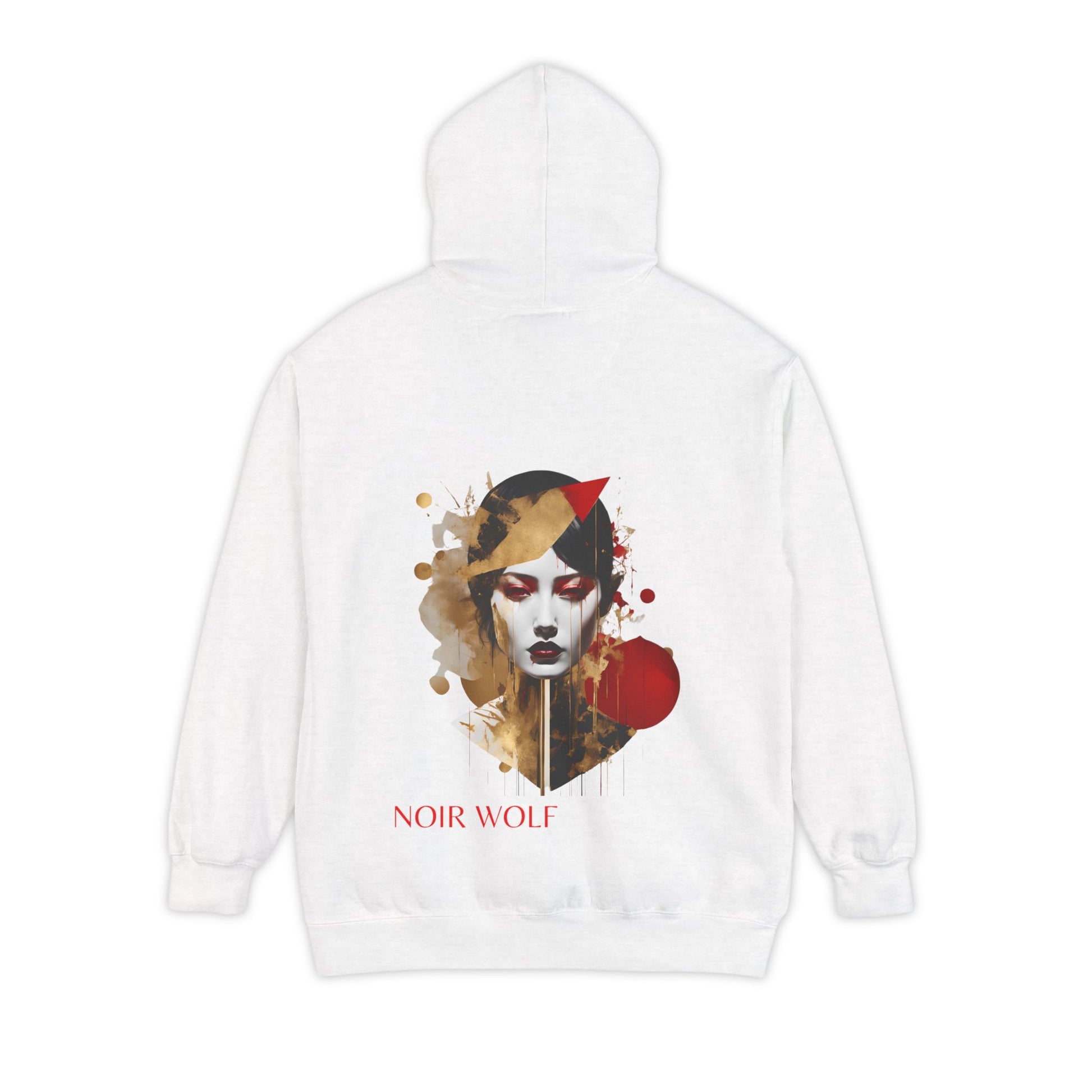 This garment-dyed hoodie blends moody art and street-ready comfort into one worn-in favorite. A heavy, relaxed hoodie with a soft, ringspun cotton face, it wears like an old find from day one. The front carries a sweeping, ink-like dragon motif with bold horizontal bars, while the back reveals a painterly portrait rendered in noir tones and splashes of red — a look that reads like a midnight story on the move. The roomy hood, twill-backed neck, and ribbed cuffs keep it grounded and wearable; the garment-dye gives the white a slightly vintage depth so the prints sit naturally against the fabric. It’s for people who favor storytelling through style — layering it over tees for late walks, pulling it on after gallery shows, or keeping it as a quiet signature in everyday rotation.