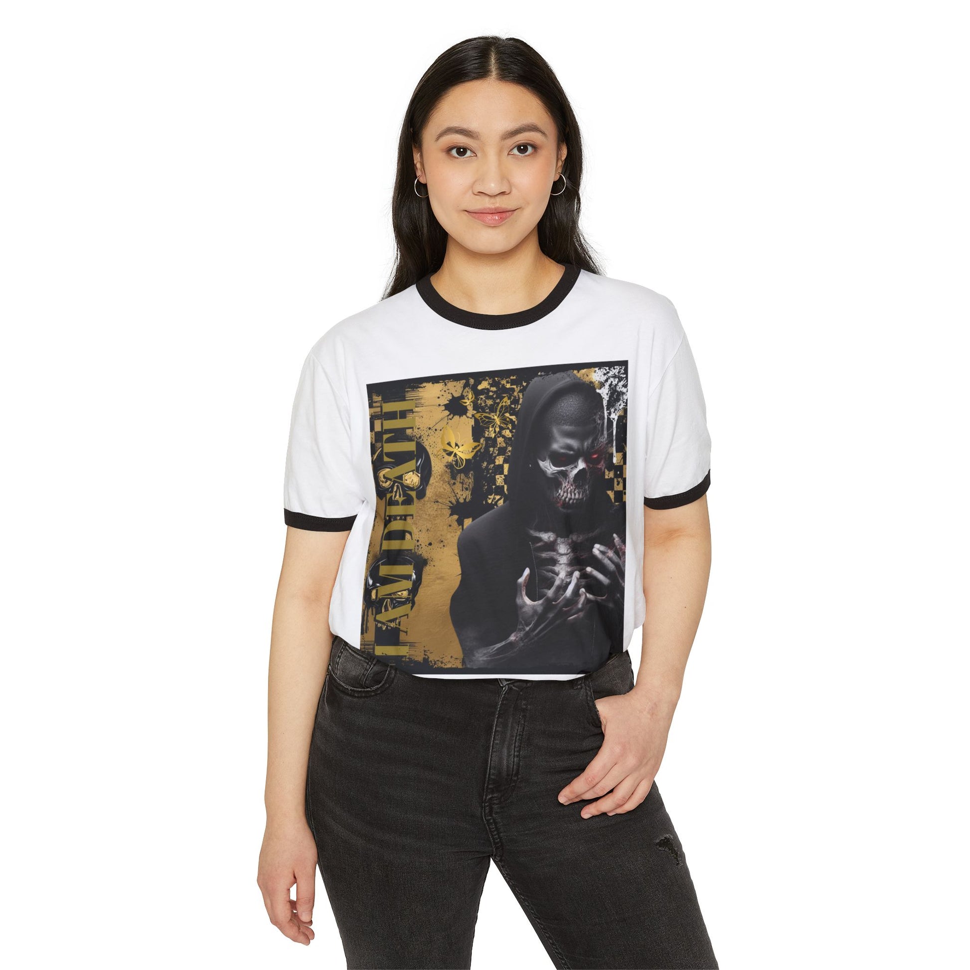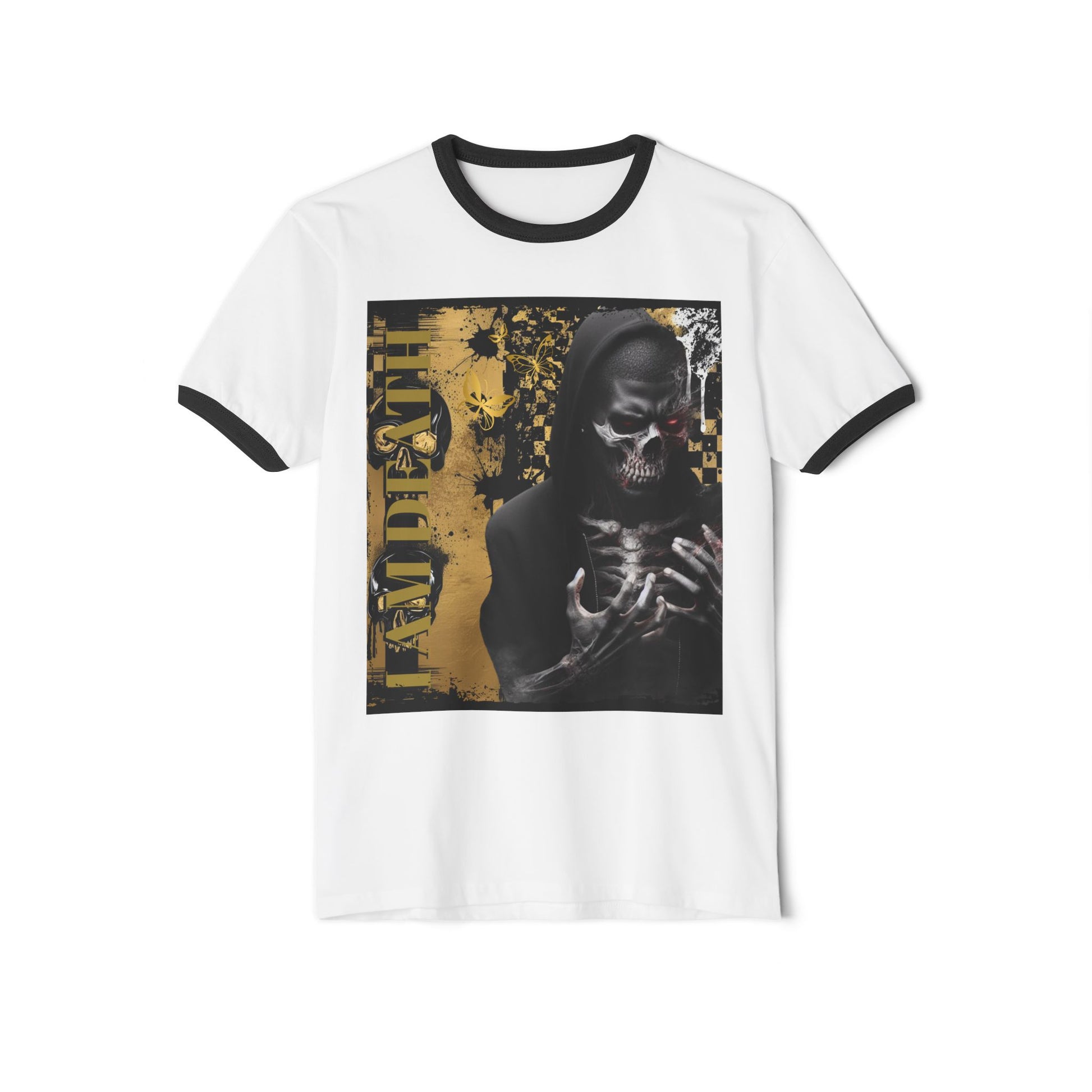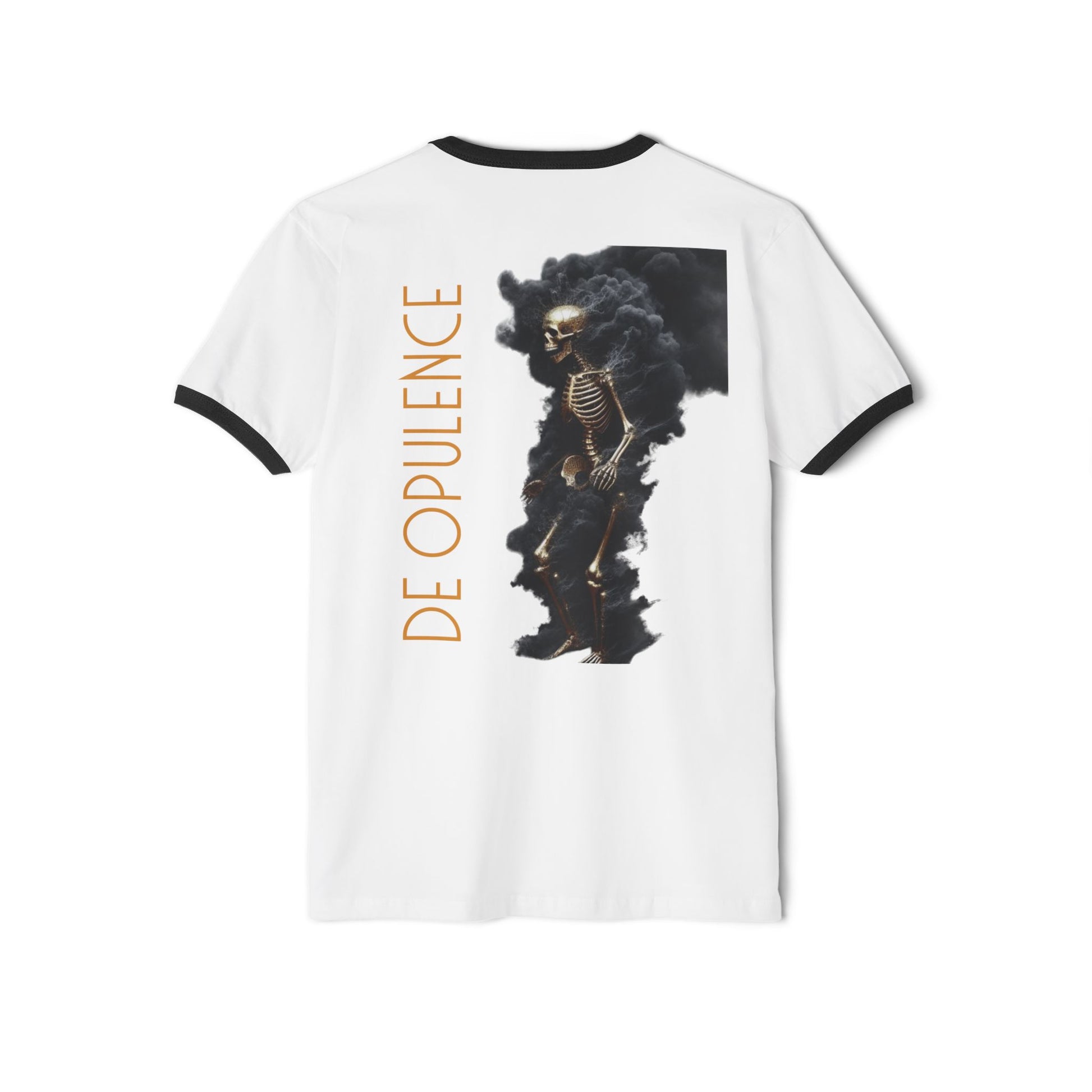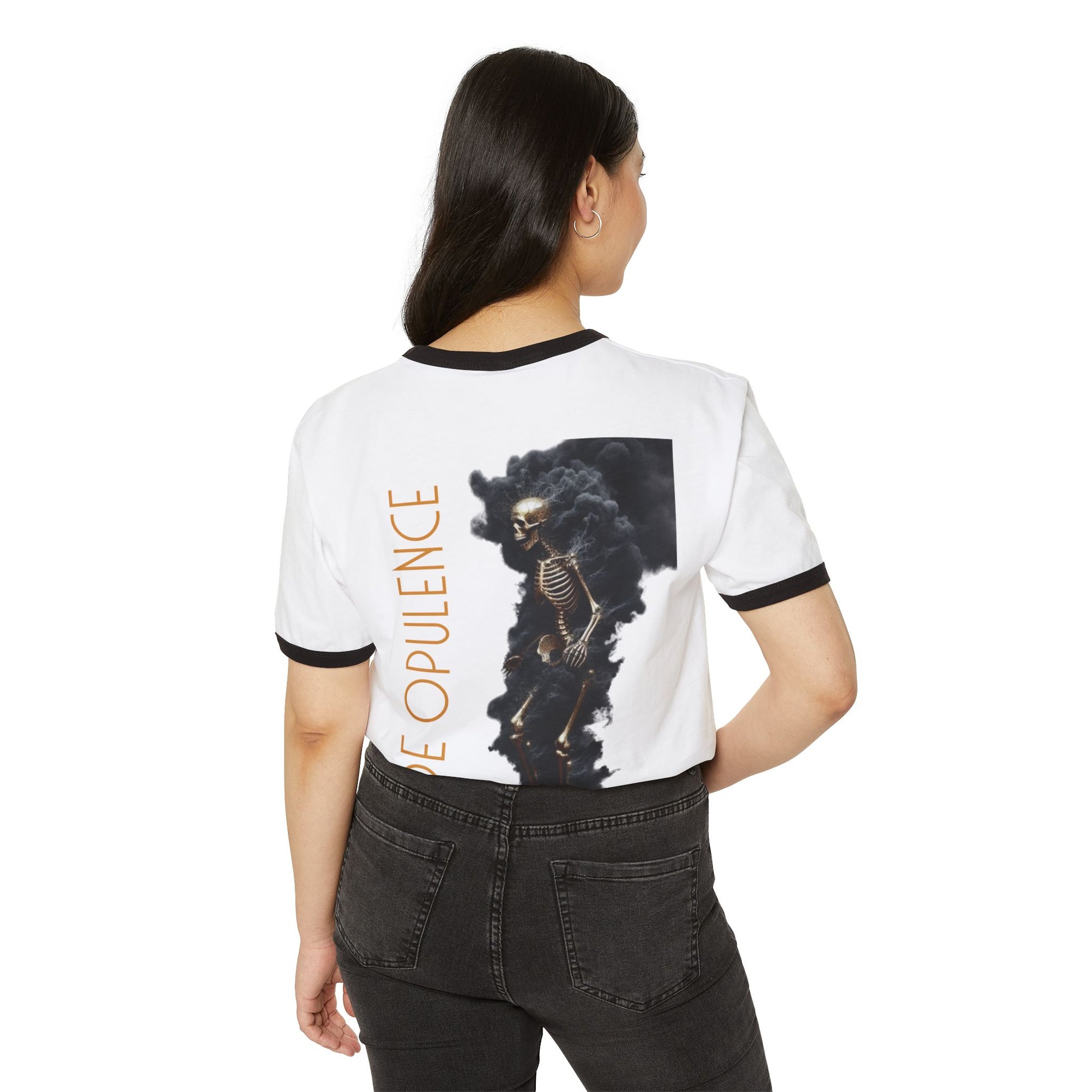 Unisex Cotton Ringer T-Shirt - Skeleton Graphic Tee with 'DE OPULENCE' Design